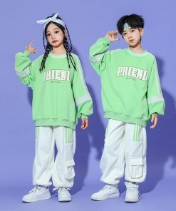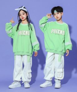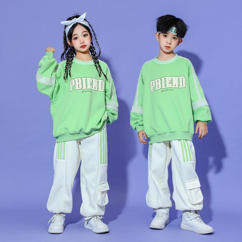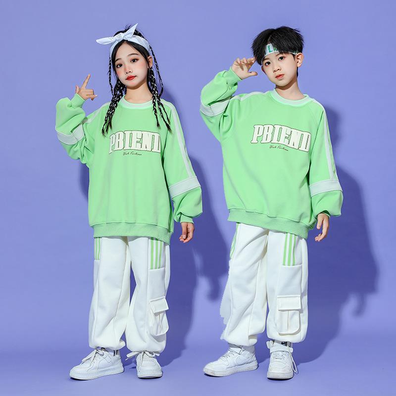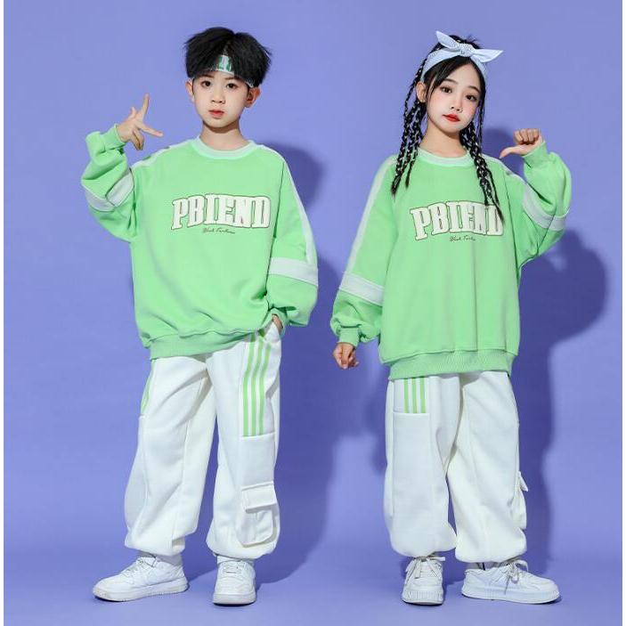 キッズヒップホップダンス 衣装 長袖Tシャツ パンツ 男女兼用 ダンス衣装 カーゴパンツ サルエルパンツ jazz hiphop かっこいい 演出服 グリーン