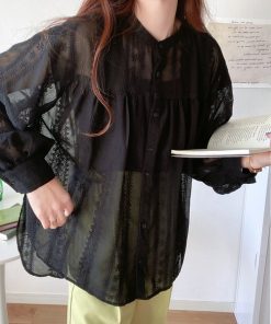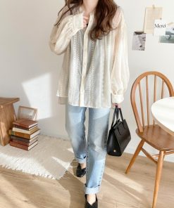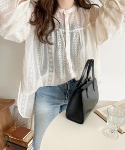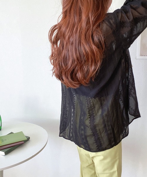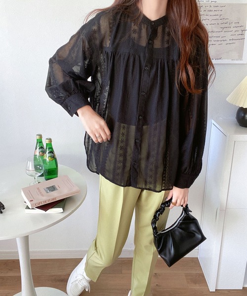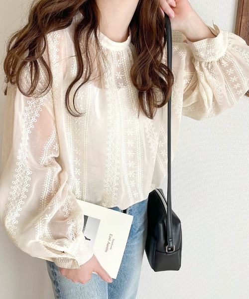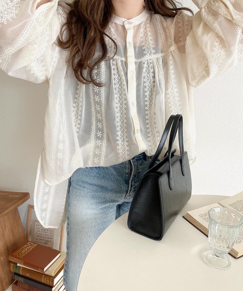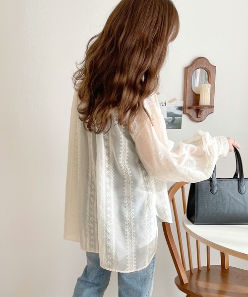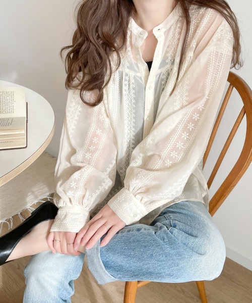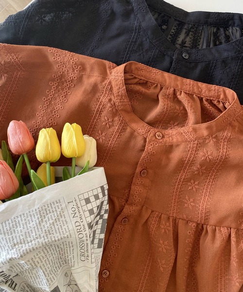 キーワード:ブラウス シャツ レディース ノーカラー ロング丈 刺繍 長袖