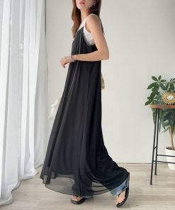 商品名:そよ風シフォン♪ふわり柔らかシルエットで“涼”を着回す。前後2wayチュールレイヤードロングキャミワンピース(ブラック&マーブル柄)