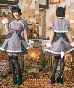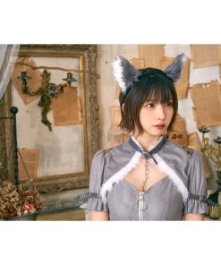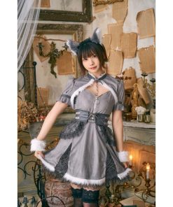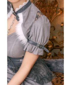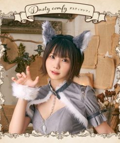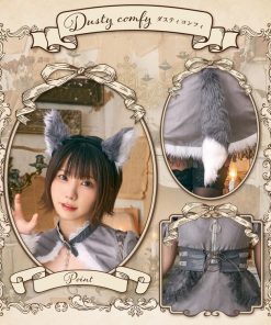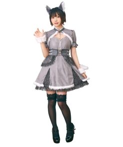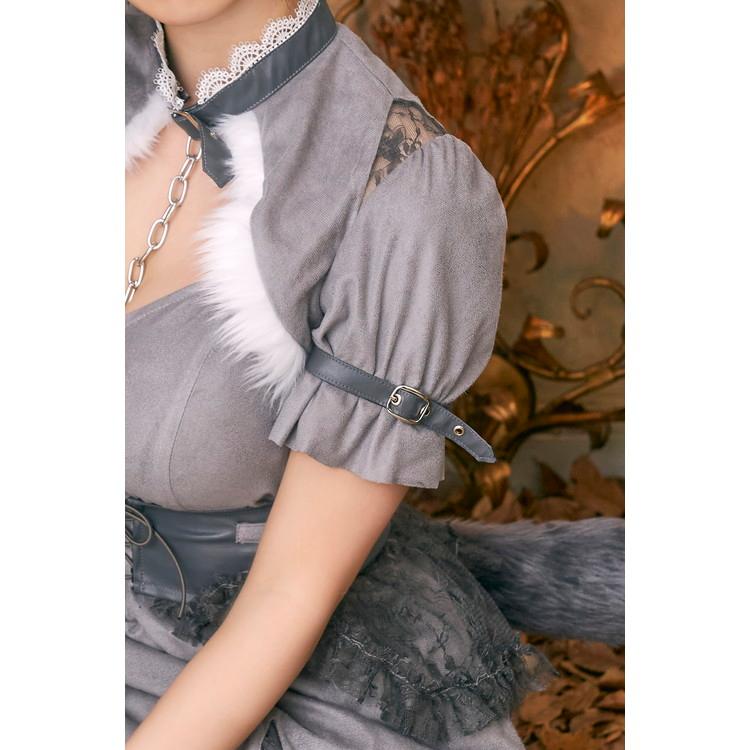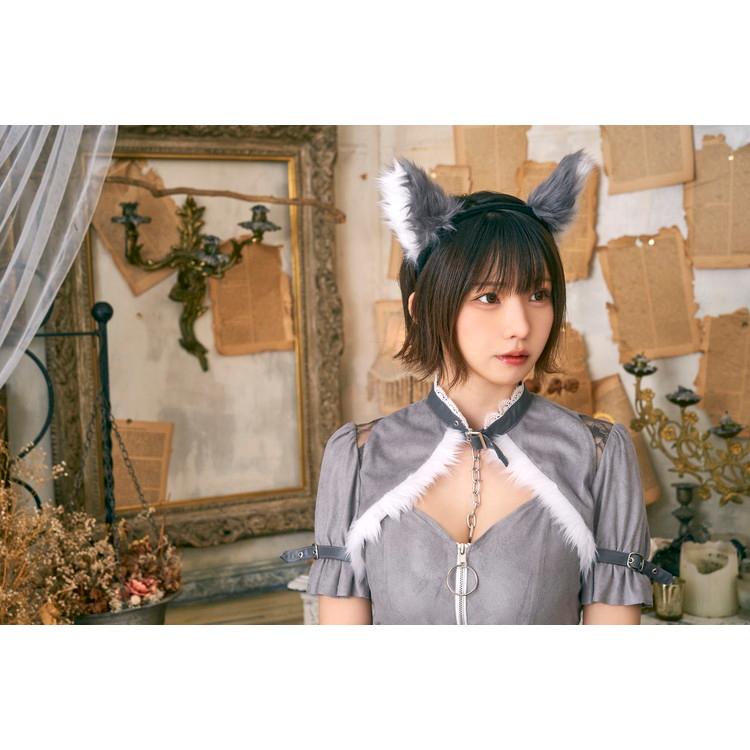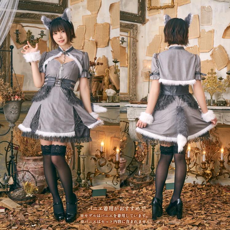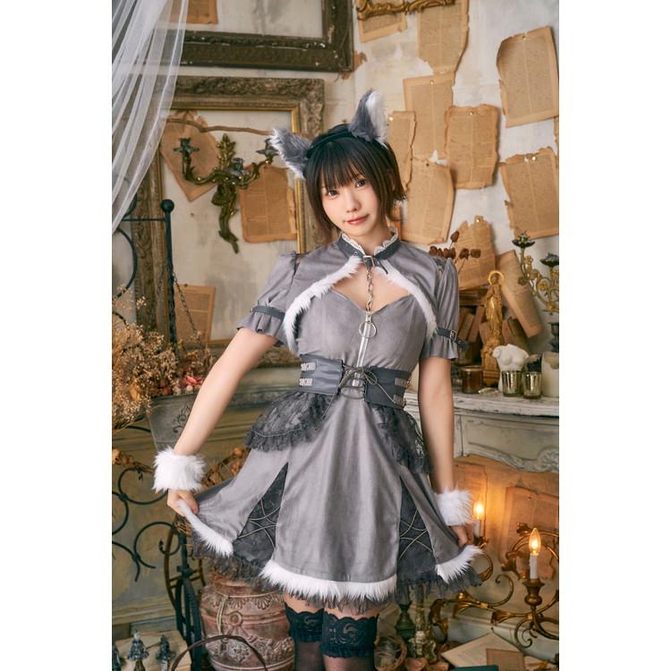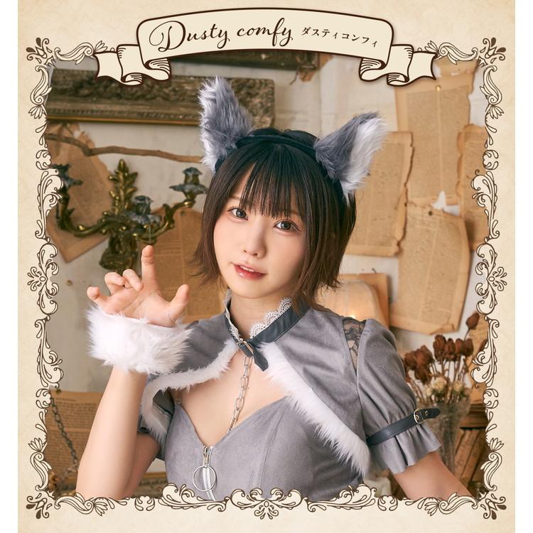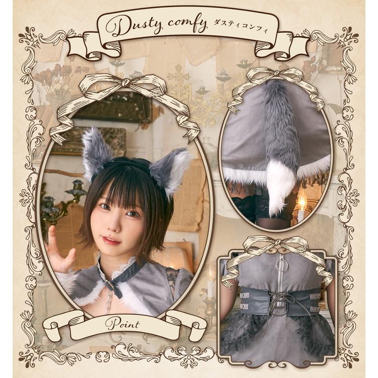グレイッシュトーンを基調とした暖かみのある雰囲気の「ダスティコンフィ」シリーズ。近年根強く人気なグレイッシュトーン(くすみカラー)をベースに、肌寒いハロウィン時期にもぴったりな秋らしいスエード素材を取り入れました。グレーの濃淡が落ち着いた雰囲気で着やすいおおかみのコスチューム。コルセットでウエストが細見えします。大きめの耳としっぽやカフス、ボレロのファー生地使いで獣っぽく。胸元のチェーンもポイント。※モデルは撮影時にパニエを着用しています。
