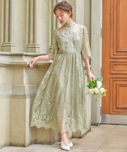 キーワード:ドレス フレア レース ロング 七分袖 五分袖 無地 エレガント オケージョン キレイめ 結婚式二次会 成人式