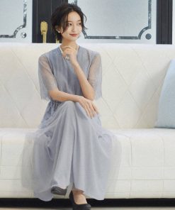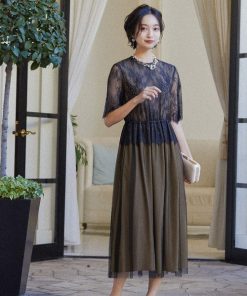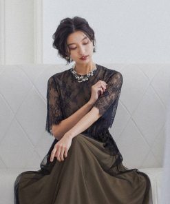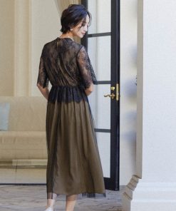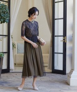 キーワード:ドレス フレア ミモレ丈 レース 花柄 刺繍 七分袖 五分袖 オケージョン フェミニン ラグジュアリー ハイブランド 結婚式二次会 秋 成人の日