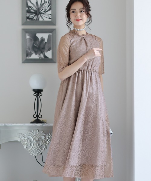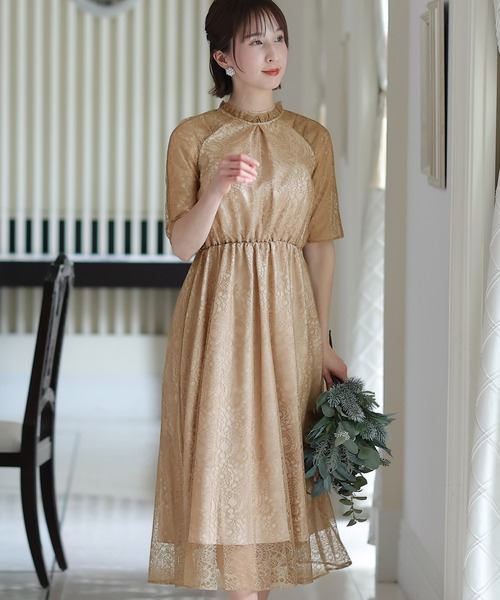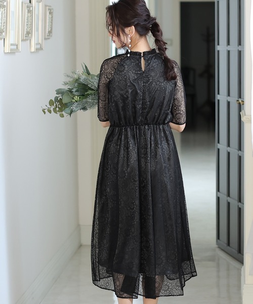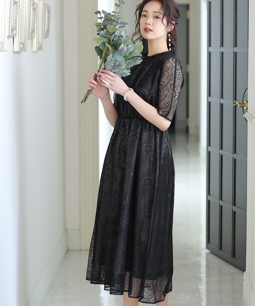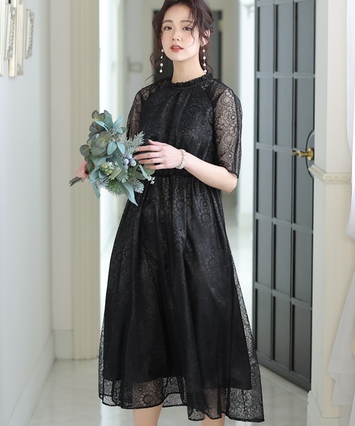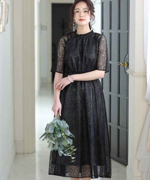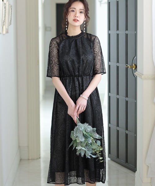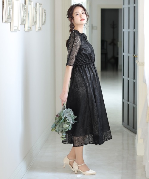 キーワード:ドレス フリル フレア ミモレ丈 レース 花柄 刺繍 半袖 無地 WEB限定 エレガント オケージョン キレイめ パーティー フェミニン 結婚式二次会 秋 定番